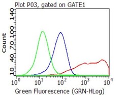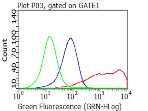 - Flow cytometric analysis of living 293T cells transfected with CD40 overexpression plasmid (RC201977), Red)/empty vector (PS100001, Blue) using anti-CD40 antibody (TA813203). Cells incubated with a non-specific antibody (Green) were used as isotype control (1:100).