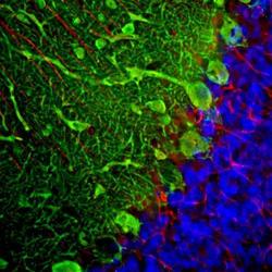 - Immunohistochemistry Free-Floating: Parvalbumin Antibody [NBP2-50036] - Analysis of a rat cerebellum section stained with chicken pAb to parvalbumin, NBP2-50036, dilution 1:2,000, in green, and costained with mouse mAb to GFAP, dilution 1:500, in red. The blue is DAPI staining of nuclear DNA. Following transcardial perfusion of rat with 4% paraformaldehyde, brain was post fixed for 24 hours, cut to 45uM, and free floating sections were stained with above antibodies. NBP2-50036 antibody labels the perikarya and dendrites of Purkinje cells and interneurons in the molecular layer of the cerebellum. The GFAP antibody stains the processes of Bergmann glia and astrocytes.