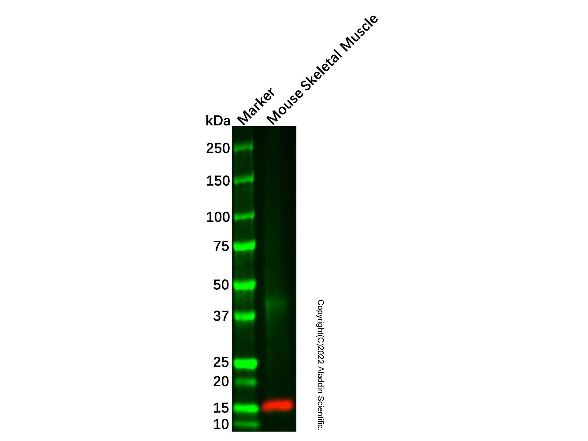 - Parvalbumin Mouse mAb (Ab179941) - Western Blot All lanes: Parvalbumin Mouse Antibody (Ab179941) at 1/10000 dilution Samples: Lysates at 20 µg per lane Secondary: Goat Anti-Mouse IgG H&L (HRP) at 1/20000 dilution Predicted band size: 12.0 kDa Observed band size: 15.6 kDa Exposure time: 15.0 s