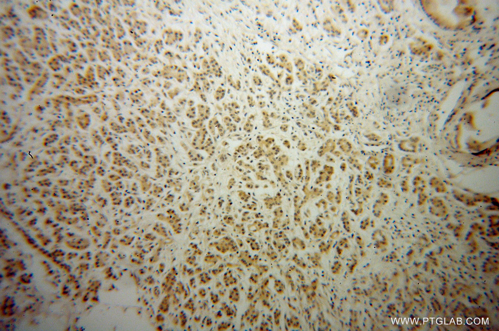 - Immunohistochemical of paraffin-embedded human pancreas cancer using 13801-1-AP(SERPINE1 antibody) at dilution of 1:50 (under 10x lens)