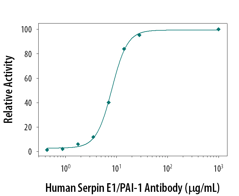 - Neutralization of Serpin E1/ PAI-1 Activity by Human Serpin E1/PAI-1 Antibody. Recombinant Human u-Plasminogen Activator (uPA)/Urokinase (0.1 µg/mL, Catalog # 1310-SE) activity is measured in the presence of Recombinant Human Serpin E1 (1.35 µg/mL, Catalog # 1786-PI) that has been preincubated with increasing concentrations of Goat Anti-Human Serpin E1/PAI-1 Antigen Affinity-purified Polyclonal Antibody (Catalog # AF1786). The ND50 is typically 10 µg/mL.