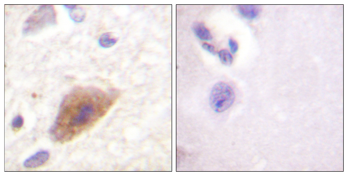 - Immunohistochemistry analysis of paraffin-embedded human brain tissue, using Tyrosine Hydroxylase Antibody. The picture on the right is blocked with the synthesized peptide.