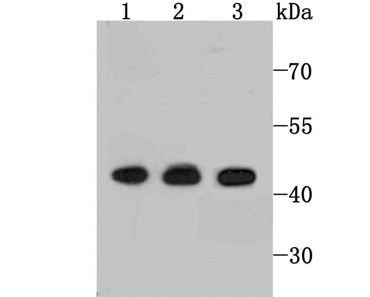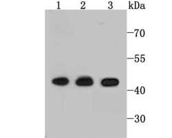 - Lane 1: Jurkat Cells; Lane 2: K562 Cells; Lane 3: HepG2 Cells; Probed with ETS1 (2A1) Monoclonal Antibody (bsm-54081R) at 1:1000 overnight at 4°C followed by a conjugated secondary antibody for 60 minutes at 37°C.