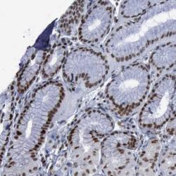 - Immunohistochemical staining of human stomach shows strong nuclear positivity in glandular cells.
