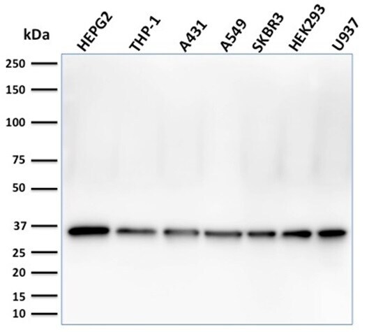 - Western blot analysis of HePG2, THP-1, A431, A549, SKBr3, HEK293 and U937 cell lines using PCNA Mouse Monoclonal Antibody (PC5).