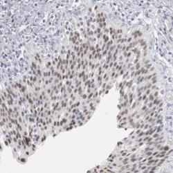 - Immunohistochemical staining of human urinary bladder shows distinct nuclear positivity in urothelial cells.