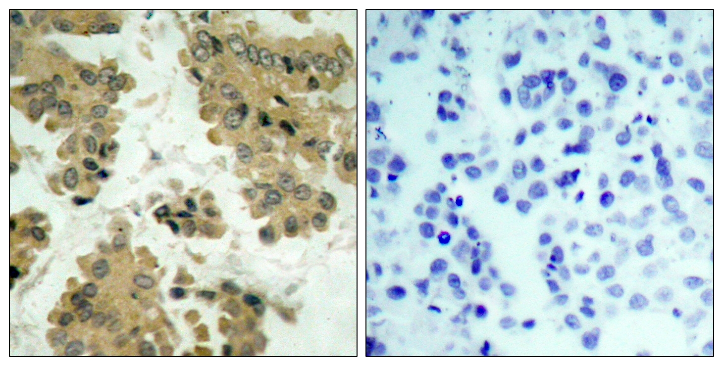 - Immunohistochemical analysis of paraffin-embedded human lung carcinoma tissue using Akt2(Ab-474) Antibody #21155(left) or the same antibody preincubated with blocking peptide(right).