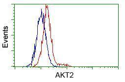 - Flow cytometric analysis of Jurkat cells, using anti-AKT2 antibody(GTX84908),(Red) compared to a nonspecific negative control antibody(TA50011)(Blue).