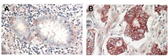 - Immunohistochemistry of Rabbit Anti-AKT antibody. Tissue: (A) normal colon tissue, (B) colon tumor tissue. Fixation: formalin fixed paraffin embedded. Antigen retrieval: not required. Primary antibody: AKT antibody at 1:1,000 dilution for 1 h at RT. Secondary antibody: Peroxidase rabbit secondary antibody at 1:10,000 for 45 min at RT. Localization: AKT is nuclear. Staining: AKT as precipitated red signal with hematoxylin purple nuclear counterstain.