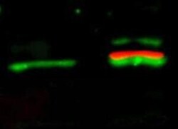 - Western Blot of simultaneous detection of unphosphorylated and phosphorylated Rabbit Anti-AKT antibody. Lane 1: unstimulated NIH/3T3 lysates contain inactive unphosphorylated Akt1, green band. Lane 2: PDGF stimulated NIH/3T3 lysate contains both inactive (green band) and activated phosphorylated Akt1 (red band). Load: 35 µg per lane. Primary antibody: rabbit anti-Akt (pan) and mouse anti-Akt pS473 specific antibodies at 1:1000 for overnight at 4°C. Secondary antibody: DyLight™ 549 conjugated anti-rabbit IgG (green) and DyLight™ 649 conjugated anti-mouse IgG (red) secondary antibodies at 1:10,000 for 45 min at RT. Block: 5% BLOTTO overnight at 4°C.