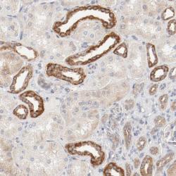 - Immunohistochemical staining of human kidney shows strong cytoplasmic positivity in cells in tubules.