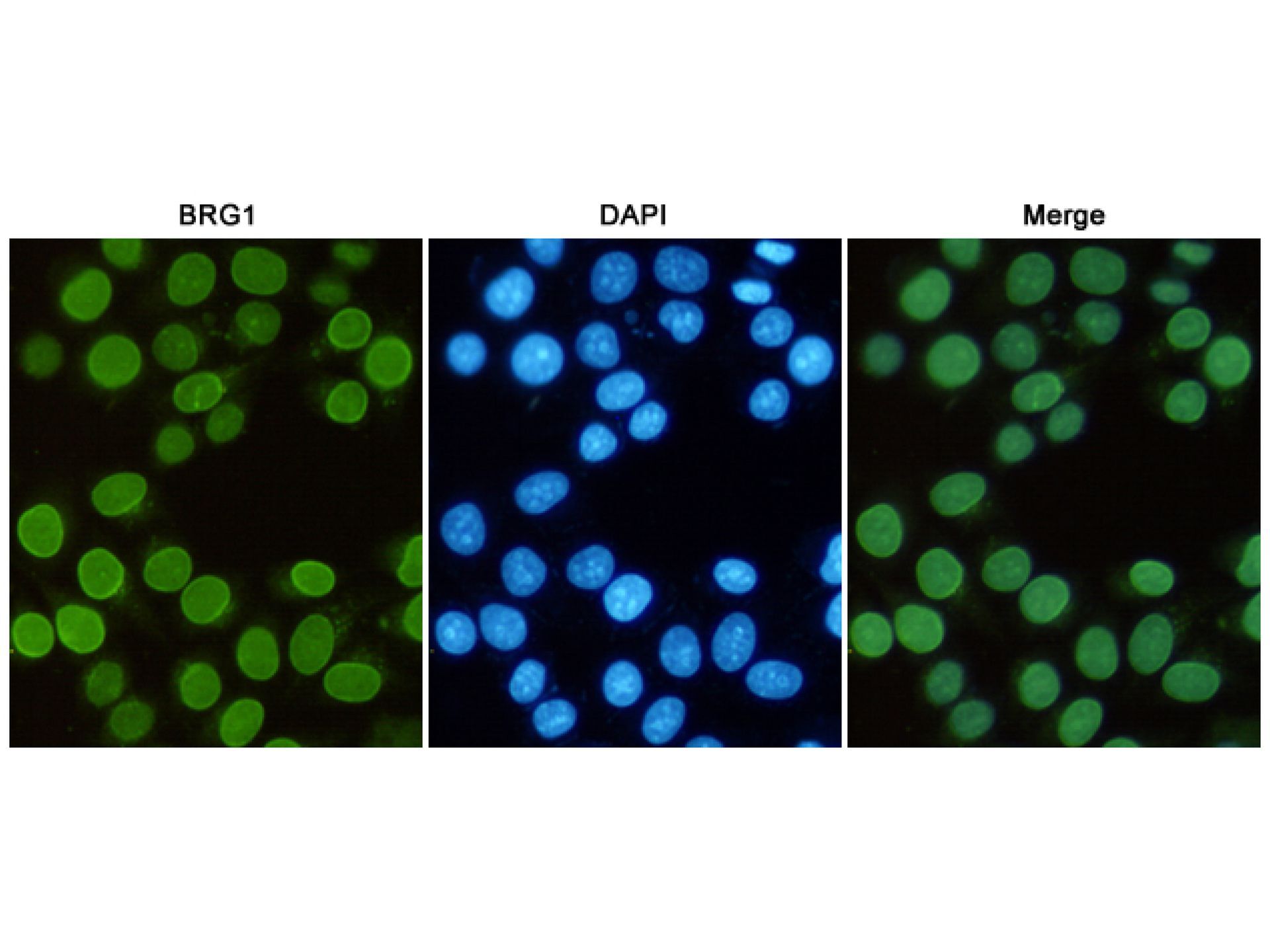 - Mouse anti Human BRG1 Antibody, Monoclonal (6D7-F7-B6), could be used for WB, ICC, IF, IP and so on.Application:WB: 1/500-1/1000ICC/IF: 1/50-1/200IP: 1/20Protein FunctionTranscriptional coactivator cooperating with nuclear hormone receptors to potentiate transcriptional activation. Component of the CREST-BRG1 complex, a multiprotein complex that regulates promoter activation by orchestrating a calcium-dependent release of a repressor complex and a recruitment of an activator complex. In resting neurons, transcription of the c-FOS promoter is inhibited by BRG1-dependent recruitment of a phospho-RB1-HDAC repressor complex. Upon calcium influx, RB1 is dephosphorylated by calcineurin, which leads to release of the repressor complex. At the same time, there is increased recruitment of CREBBP to the promoter by a CREST-dependent mechanism, which leads to transcriptional activation. The CREST-BRG1 complex also binds to the NR2B promoter, and activity-dependent induction of NR2B expression involves a release of HDAC1 and recruitment of CREBBP. Belongs to the neural progenitors-specific chromatin remodeling complex (npBAF complex) and the neuron-specific chromatin remodeling complex (nBAF complex). During neural development a switch from a stem/progenitor to a post-mitotic chromatin remodeling mechanism occurs as neurons exit the cell cycle and become committed to their adult state. The transition from proliferating neural stem/progenitor cells to post-mitotic neurons requires a switch in subunit composition of the npBAF and nBAF complexes. As neural progenitors exit mitosis and differentiate into neurons, npBAF complexes which contain ACTL6A/BAF53A and PHF10/BAF45A, are exchanged for homologous alternative ACTL6B/BAF53B and DPF1/BAF45B or DPF3/BAF45C subunits in neuron-specific complexes (nBAF). The npBAF complex is essential for the self-renewal/proliferative capacity of the multipotent neural stem cells. The nBAF complex along with CREST plays a role regulating the activity of genes essential for dendrite growth. SMARCA4/BAF190A may promote neural stem cell self-renewal/proliferation by enhancing Notch-dependent proliferative signals, while concurrently making the neural stem cell insensitive to SHH-dependent differentiating cues (By similarity). Also involved in vitamin D-coupled transcription regulation via its association with the WINAC complex, a chromatin-remodeling complex recruited by vitamin D receptor (VDR), which is required for the ligand-bound VDR-mediated transrepression of the CYP27B1 gene. Acts as a corepressor of ZEB1 to regulate E-cadherin transcription and is required for induction of epithelial-mesenchymal transition (EMT) by ZEB1.