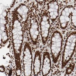 - Immunohistochemical staining of human colon shows strong nuclear positivity in glandular cells.