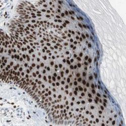 - Immunohistochemical staining of human skin shows strong nuclear positivity in epidermal cells.