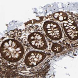 - Immunohistochemical staining of human colon shows strong cytoplasmic positivity in glandular cells.