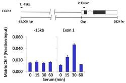- Chromatin immunoprecipitation analysis of ERK2/MAPK1 was performed using cross-linked chromatin from 1 x 106 HCT116 colon carcinoma cells treated with serum for 0, 15, 30, and 60 minutes. Immunoprecipitation was performed using a multiplex microplate Matrix ChIP assay (see reference for Matrix ChIP protocol: http://www.ncbi.nlm.nih.gov/pubmed/22098709) with 1.0 µL/100 µL well volume of an ERK2/MAPK1 monoclonal antibody (Product # MA1-099). Chromatin aliquots from ~1 x 105 cells were used per ChIP pull-down. Quantitative PCR data were done in quadruplicate using 1 µL of eluted DNA in 2 µL SYBR real-time PCR reactions containing primers to amplify -15kb upstream of the Egr1 gene or exon-1 of Egr1. PCR calibration curves were generated for each primer pair from a dilution series of sheared total genomic DNA. Quantitation of immunoprecipitated chromatin is presented as signal relative to the total amount of input chromatin. Results represent the mean +/- SEM for three experiments. A schematic representation of the Egr-1 locus is shown above the data where boxes represent exons (black boxes = translated regions, white boxes = untranslated regions); the zigzag line represents an intron; and the straight line represents upstream sequence. Regions amplified by Egr-1 primers are represented by black bars. Data courtesy of the Innovators Program.