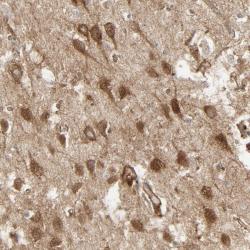 - Immunohistochemical staining of human hippocampus shows strong cytoplasmic positivity in neuronal cells.