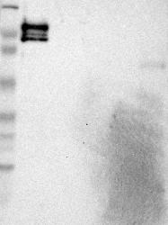 - Band of predicted size in kDa (+/-20%) with additional bands present.