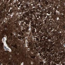 - Immunohistochemical staining of human hippocampus shows strong cytoplasmic positivity in neuronal cells.