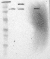 - Band of predicted size in kDa (+/-20%) with additional bands present.