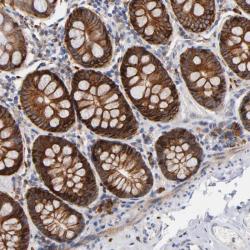 - Immunohistochemical staining of human colon shows strong cytoplasmic and membrane positivity in glandular cells.