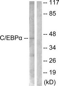 - Western blot analysis of extracts from 293 cells treated with Insulin (0.01U/ml, 15mins), using C/EBP-α (Ab-21) antibody. The lane on the right is treated with the synthesized peptide.