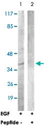- Western blot analysis of extracts from COS-7 cells, treated with EGF (200 ng/ml, 30 mins), using CEBPA polyclonal antibody (Cat # PAB17302).Peptide "+" means "with peptide blocking".