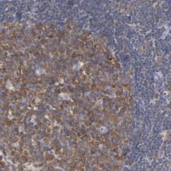 - Immunohistochemical staining of human lymph node shows distinct cytoplasmic positivity in reaction center cells.