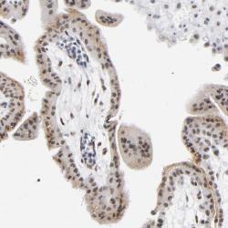 - Immunohistochemical staining of human placenta shows moderate nuclear positivity in trophoblastic cells.