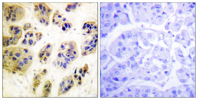- Immunohistochemistry analysis of paraffin-embedded human breast carcinoma, using CBL (Phospho-Tyr700) Antibody. The picture on the right is blocked with the phospho peptide.