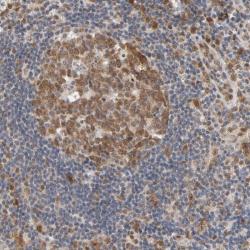 - Immunohistochemical staining of human lymph node shows distinct cytoplasmic positivity in reaction center cells.