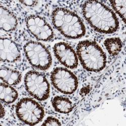 - Immunohistochemical staining of human colon shows strong nuclear positivity in glandular cells.