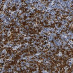 - Immunohistochemical staining of human lymph node shows strong cytoplasmic and nuclear positivity in lymphoid cells outside reaction centra.