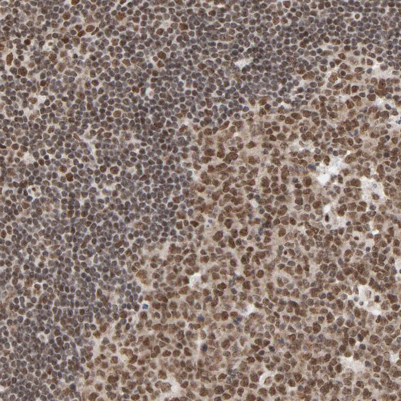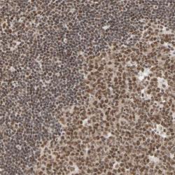 - Immunohistochemical staining of human lymph node shows distinct nuclear positivity in reaction center cells and lymphoid cells outside reaction centra.