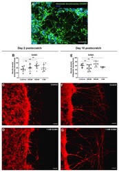 - Figure 7 GABA does not affect neurite outgrowth in scratch assay. ( A ) hiNSC-derived day 10 neuronal culture shows presence of GABAergic neurons (glutamate decarboxylase--GAD67 marker). ( B ) GABA treatment (48 h) shows no significant change in scratch neurite density on day 2 post-scratch. ( C , D ) Representative images of Calcein Red-Orange AM stained control neural cultures ( C ) and neural cultures treated with 1 mM GABA ( D ) on day 2 post-scratch showing no discernable change in neurite outgrowths with GABA treatment. ( E ) GABA treatment (48 h) shows no significant change in scratch neurite density on day 10 post-scratch. ( F , G ) Representative images of Calcein Red-Orange AM stained control neural cultures ( F ) and neural cultures treated with 1 mM GABA ( G ) on day 10 post-scratch showing no discernable change in neurite outgrowth with GABA treatment. All data are represented as mean +- S.D. ns--not significant. All scale bars, 100 um.