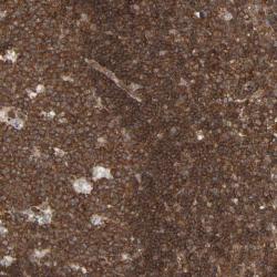 - Immunohistochemical staining of human lymph node shows strong cytoplasmic positivity in reaction center cells and lymphoid cells outside reaction centra.