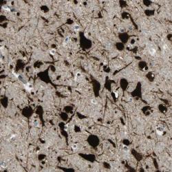 - Immunohistochemical staining of human cerebral cortex shows strong cytoplasmic and nuclear positivity in neuronal cells.