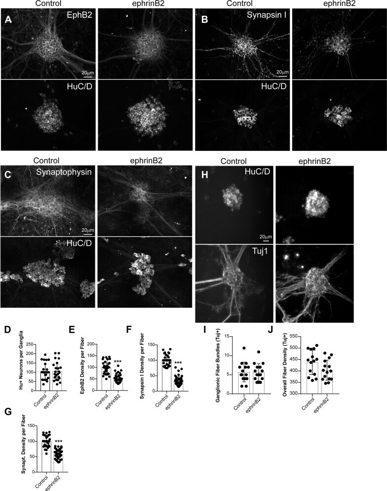 - Figure 5 Chronic activation with ephrinB2 reduces levels of EphB2 and synaptic-associated proteins in ENS cultures. A - C , primary cultures of E15 rat intestines were grown on glass coverslips and fully matured into an enteric-like neuronal network with ganglia interconnected with neural fibers at 12 DIV. Cultures were then treated with control-Fc (Control) or ephrinB2-Fc ligand (ephrinB2) for 5 consecutive days. Cultures were fixed and double-immunostained for EphB2 ( A ), synapsin I ( B ), synaptophysin ( C ) and pan-neuronal marker HuC/D ( A - C ). Images represent ganglia depicting neuronal cell bodies and processes. D - F , quantitations of images represented in ( A - C ) for HuC/D-positive neurons ( D ), and neuronal fiber density of EphB2 ( E ), synapsin I ( F ) or synaptophysin ( G ). Note that chronic exposure of neurons to ephrinB2 decreased EphB2 expression within neuronal processes without affecting overall neuronal density. Synapsin I and synaptophysin were reduced within neuronal processes. H , images represent ganglia depicting neuronal cell bodies (HuC/D staining) and neuronal processes (Tuj-1 staining). I and J , quantitations of images represented in ( H ) for the number of neuronal processes/ganglionic fiber bundles ( I ) and overall fiber density ( J ). (n = 10-15 ganglia per condition from at least three independent cultures, unpaired t test). *** p
