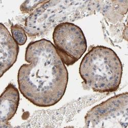 - Immunohistochemical staining of human placenta shows strong membranous positivity in trophoblastic cells.