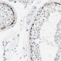 - Immunohistochemical staining of human testis shows distinct cytoplasmic positivity in basal cells.