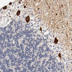 - Immunohistochemical staining of human cerebellum shows strong cytoplasmic positivity in purkinje cells.