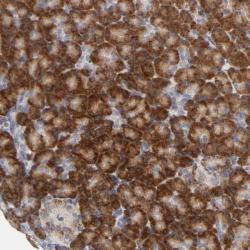 - Immunohistochemical staining of human pancreas shows strong cytoplasmic positivity in exocrine glandular cells.