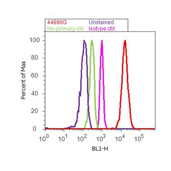 - Flow cytometry analysis of JNK1 was done on A-431. Cells were fixed with 70% ethanol for 10 minutes, permeabilized with 0.25% Triton™ X-100 for 20 minutes, and blocked with 5% BSA for 30 minutes at room temperature. Cells were labeled with JNK1 Rabbit Polyclonal Antibody (44690G, red histogram) or with rabbit isotype control (pink histogram) at 3-5 ug/million cells in 2.5% BSA. After incubation at room temperature for 2 hours, the cells were labeled with Alexa Fluor® 488 Goat Anti-Rabbit Secondary Antibody (A11008) at a dilution of 1:400 for 30 minutes at room temperature. The representative 10,000 cells were acquired and analyzed for each sample using an Attune® Acoustic Focusing Cytometer. The purple histogram represents unstained control cells and the green histogram represents no-primary-antibody control.