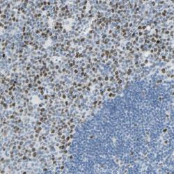 - Immunohistochemical staining of human lymph node shows distinct nuclear positivity in reaction center cells.