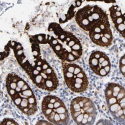 - Immunohistochemical staining of human colon shows strong cytoplasmic positivity in glandular cells.