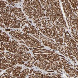 - Immunohistochemical staining of human smooth muscle shows strong cytoplasmic positivity in smooth muscle cells.