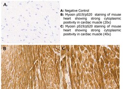 - Immunohistochemistry with anti-myosin pS19/pS20 antibody showing strong cytoplasmic staining of myocytes in mouse heart muscle 20x and 40x (B & C). Staining was performed on Leica Bond system using the standard protocol. Formalin fixed/paraffin embedded tissue sections were subjected to antigen retrieval and then incubated with rabbit anti-myosin pS19/pS20 antibody at 1:100 dilution for 60 minutes. Biotinylated Anti-rabbit secondary antibody was used to detect primary antibody. The reaction was developed using streptavidin-HRP conjugated compact polymer system and visualized with chromogen substrate, 33-diamino-benzidine substrate (DAB). The sections were then counterstained with hematoxylin to detect cell nuclei.