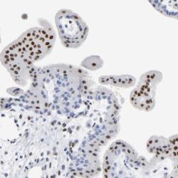 - Immunohistochemical staining of human placenta shows strong nuclear positivity in syncytiotrophoblasts.