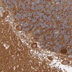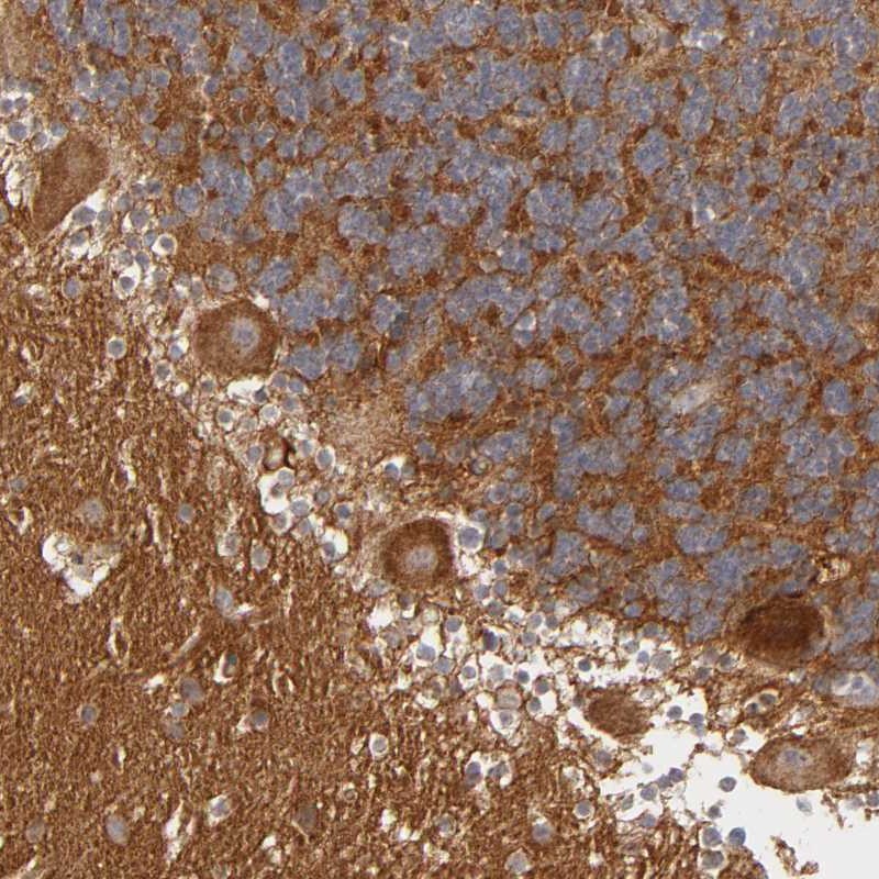 - Immunohistochemical staining of human cerebellum shows strong cytoplasmic positivity in purkinje cells.