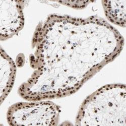 - Immunohistochemical staining of human placenta shows strong nuclear positivity in trophoblastic cells.